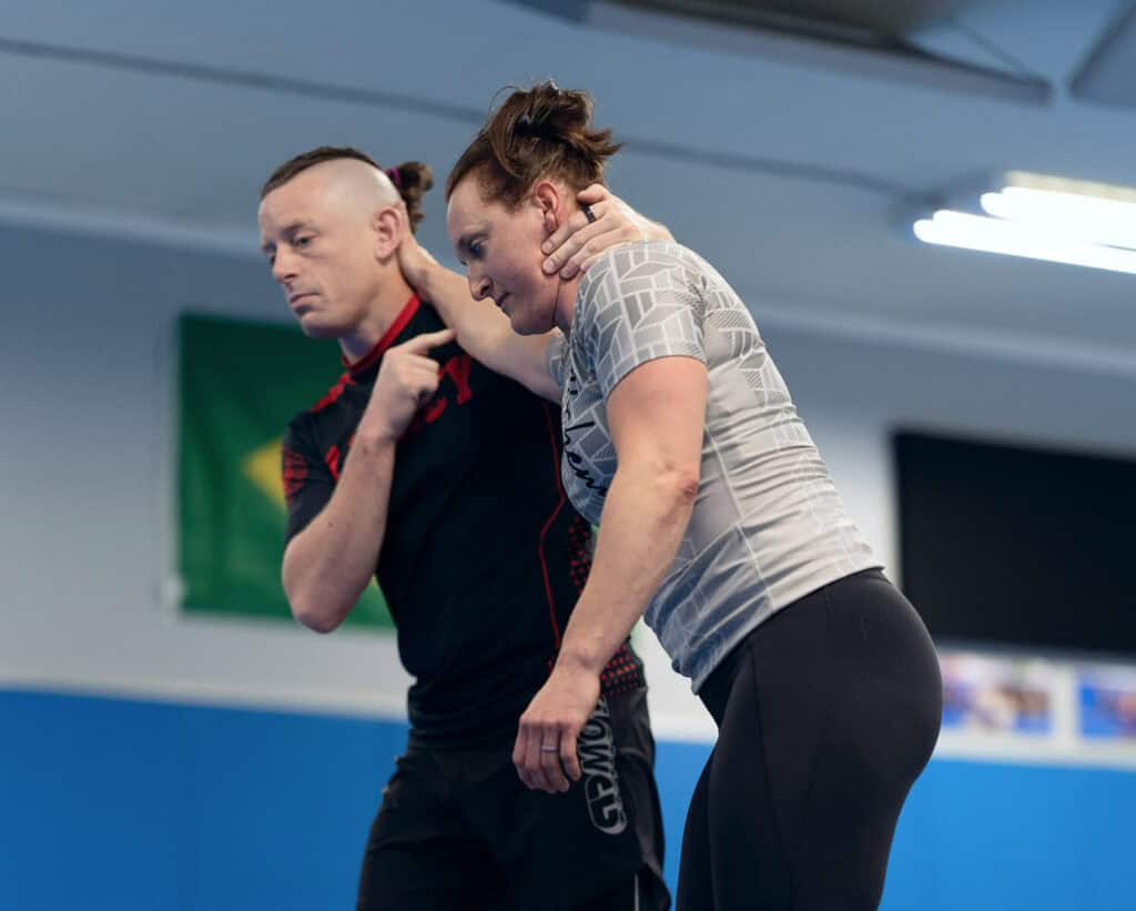 Our training focuses on simple, high-percentage techniques that work — regardless of size, strength, or experience. You’ll learn how to escape common grabs, create space, strike effectively, and defend yourself in close-contact situations using leverage, positioning, and smart movement rather than brute force.